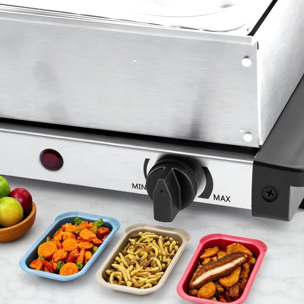 ودّع الأكل البارد مع جهاز البوفيه الكهربائي المكون من 4 صواني – مثالي للحفلات، العزائم، واجتماعات العائلة. يحافظ هذا الجهاز الذكي على حرارة الطعام المطبوخ ويجعله جاهزاً للتقديم لفترات طويلة. مزوّد بصواني من الستانلس ستيل مع أغطية شفافة، وسطح تدفئة معدني، ودرجة حرارة قابلة للتحكم. سهل الاستخدام، آمن، وعملي في أي مناسبة.