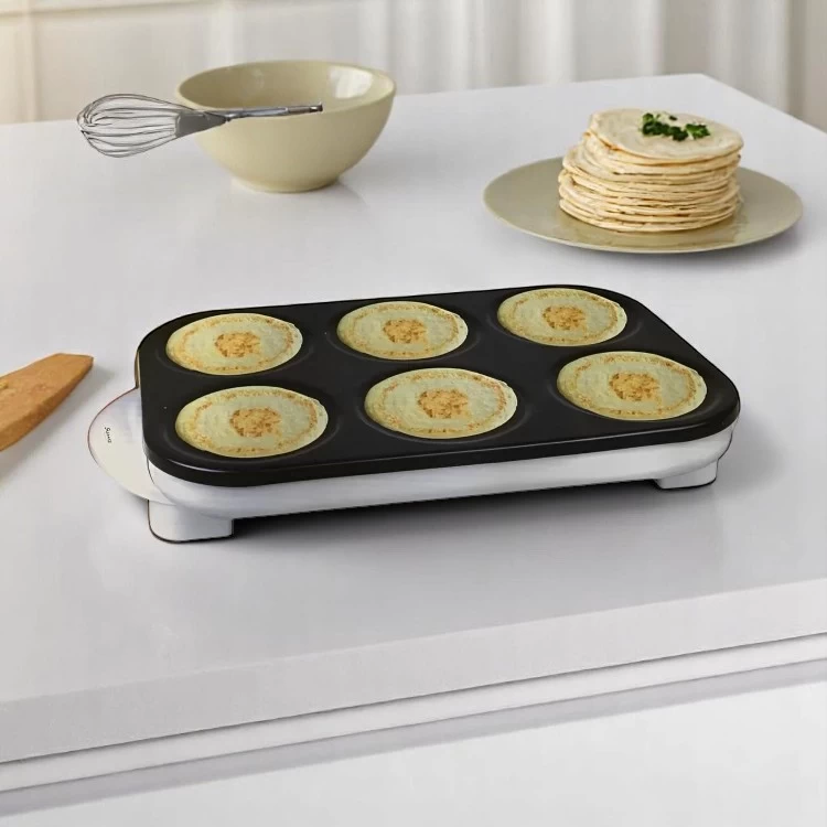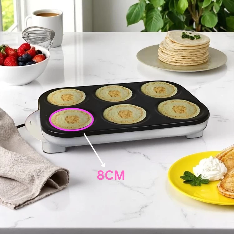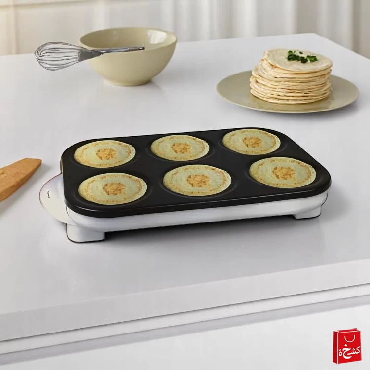 صانعة البان كيك من Sumo هي جهازك المثالي في المطبخ لتحضير بان كيك لذيذ ومتناسق بسرعة وسهولة. تحتوي على 6 قوالب دائرية (كل قالب بقطر 8 سم)، مما يسمح لك بتحضير عدة قطع في نفس الوقت — مثالية للعائلات، والصباحات السريعة، أو عند استضافة الضيوف. سواء كنتِ تقدّمين فطوراً، برنش، أو وجبة خفيفة، فإن هذا الجهاز يوفر توزيعاً متساوياً للحرارة، وسهولة في الاستخدام والتنظيف.