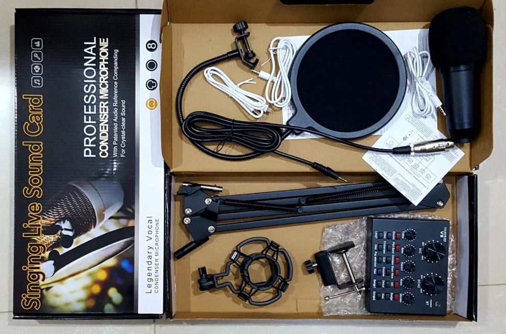 ✅ مجموعة شاملة متكاملة – تشمل ميكروفون استوديو مكثف، ذراع قابل للتعديل، فلتر هواء، غطاء ميكروفون، ولوحة تحكم صوتية احترافية