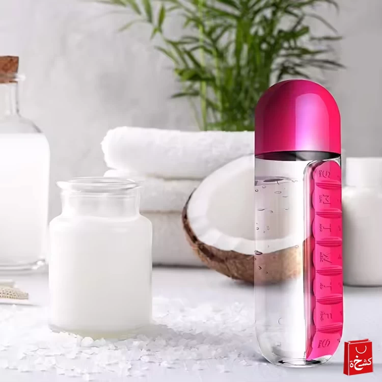💧 زجاجة ماء مع منظم حبوب وفيتامينات 🥤 | 600 مل | علبة حبوب أسبوعية + ترطيب محمول