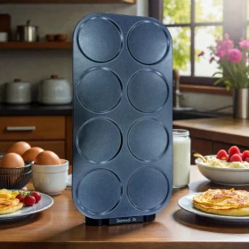 aتُعد صانعة الأومليت والبنك كيك من Sumo جهازًا عمليًا وموفرًا للوقت، مصممًا لتحضير البنك كيك الدائري، الأومليت، البيض، البليني، ووصفات الفطور المعتمدة على العجين بكل سهولة. بفضل 8 صحون طهي غير لاصقة وقوة تسخين عالية 1350 واط مع ثرموستات أوتوماتيكي، ستحصل على طهي سريع ومتوازن دون فوضى — مثالية للعائلات والصباحات المزدحمة.