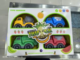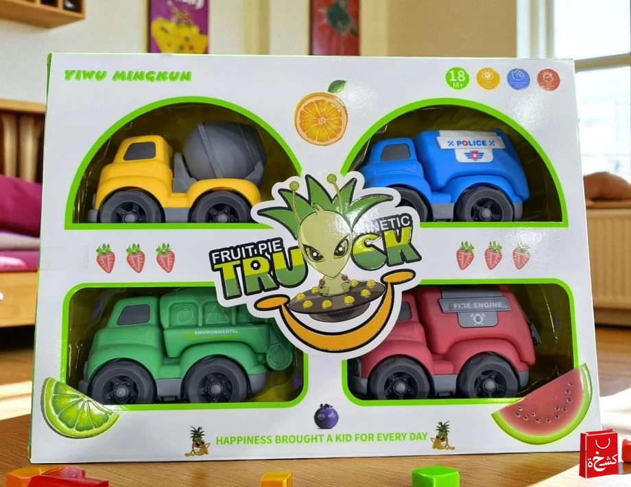• 📦 محتوى المجموعة: 4 شاحنات كرتونية
