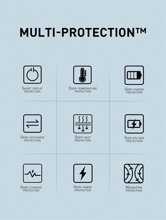 • 🔐 نظام حماية ذكي – حماية من الحرارة الزائدة والشحن الزائد والدوائر القصيرة