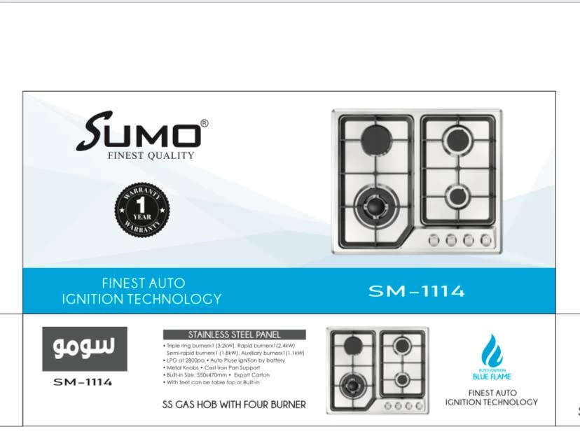 اطبخ بسرعة وكفاءة مع موقد الغاز سمو SM-1114 المزوّد بـ 4 عيون عالية الأداء لطهي عدة أطباق في نفس الوقت. مثالي للعائلات وعشاق الطبخ، حيث يجمع بين المتانة والأناقة والراحة في جهاز واحد.