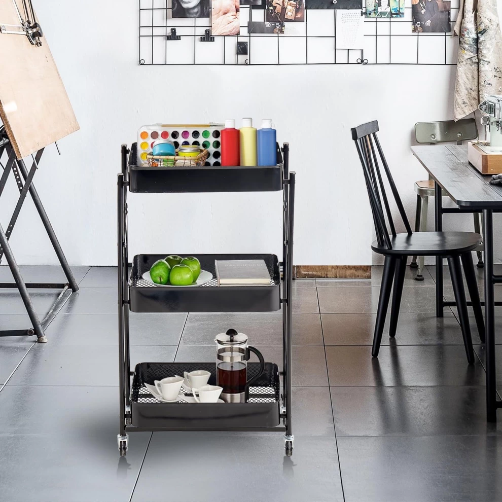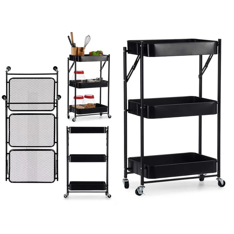 عربة تخزين معدنية متعددة الاستخدام – 3 أرفف قابلة للطي بعجلات مقاس 77×46×30 سم