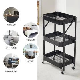 تتميز بتصميم قابل للطي، عجلات دوارة، وهيكل معدني قوي — مناسبة للمنازل، المكاتب، والمطابخ.