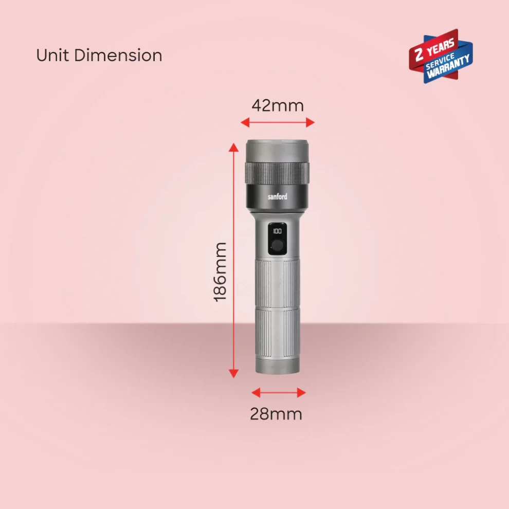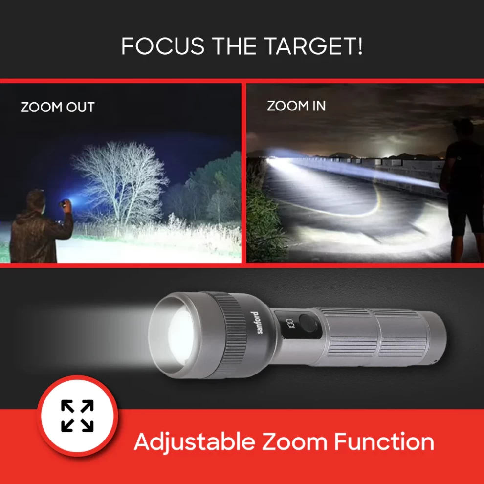 تمتع بإضاءة قوية مع كشاف Sanford SF6198SL القابل للشحن، المزود بتقنية LED ليزري بقوة 40 واط لتوفير سطوع قوي ومدى إضاءة ممتاز. يأتي مع خاصية الزووم، 5 أوضاع إضاءة، وشاشة رقمية لعرض مستوى البطارية، مما يجعله مثاليًا للرحلات، الطوارئ، والعمل اليومي.