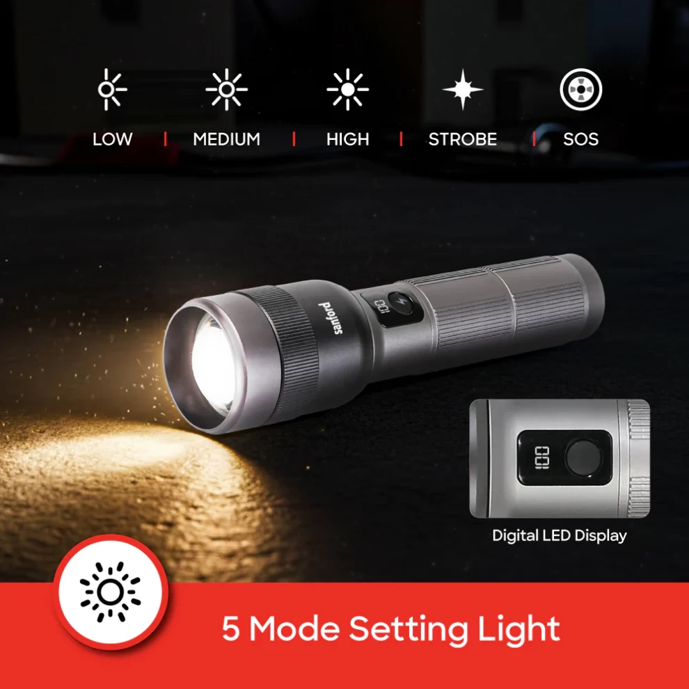 • 🔄 5 أوضاع إضاءة – عالي / متوسط / منخفض / وميض / SOS