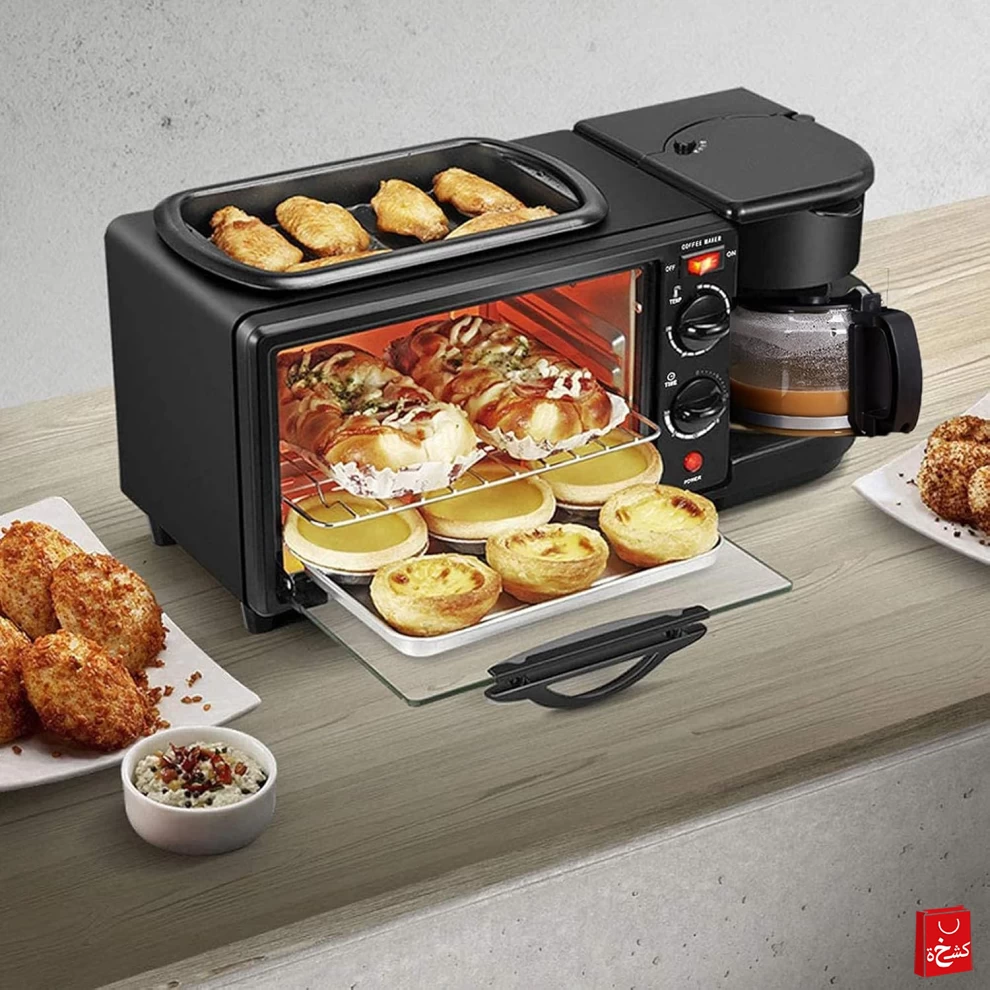 ابدأ صباحك بسهولة وسرعة مع ماكينة الفطور المتعددة الوظائف 3 في 1! تجمع هذه الآلة بين فرن صغير، ماكينة قهوة، وصينية شواء في جهاز واحد، لتتمكن من تحضير إفطارك كاملًا في دقائق. مثالية للمنزل، المكاتب، والشقق الصغيرة.