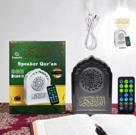 Experience the beauty of Quran recitation anytime, anywhere with this portable and elegant Bluetooth Quran Speaker. With 8GB of built-in memory, FM radio functionality, remote control, and multiple playback options, it's perfect for daily spiritual use or as a thoughtful gift. Enjoy clear audio, multiple reciters, translations, and more in one compact device.