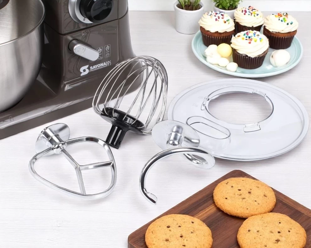 • 🧰 3 Attachments – Dough hook, whisk, and flat beater
