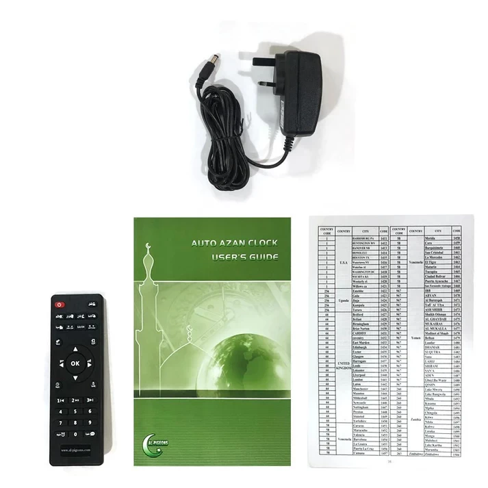 • Functions: Azan prayer times, Qibla direction, Hijri & Gregorian calendar, temperature display, alarms
