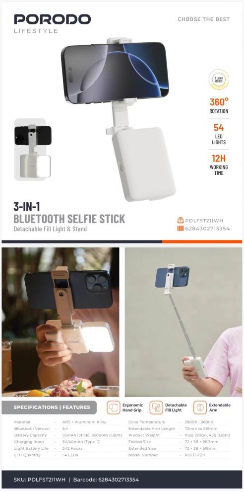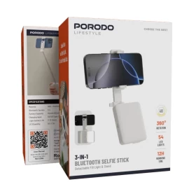Capture perfect moments anywhere with the Porodo Lifestyle 3-In-1 Bluetooth Selfie Stick. Designed for convenience, portability, and stability, it transforms into a tripod, includes a detachable Bluetooth remote, and extends for wide-angle shots — ideal for selfies, vlogging, travel, and group photos.