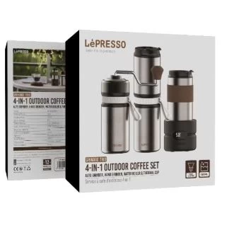 The LePresso Grindo Quattro Coffee Set is built with durable stainless steel and premium components, ensuring reliable performance for outdoor brewing and travel convenience.